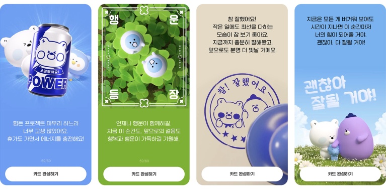또한, 응원과 격려의 마음을 전할 수 있는 신규 e-card 4종도 함께 출시되었습니다. ‘쏠 에너지 드링크’, 네잎 클로버, ‘참 잘했어요’ 도장 등 긍정적인 메시지를 담은 디자인으로 구성되어, 바쁜 일상에 지친 지인들에게 따뜻한 응원의 말을 전하기에 제격입니다.